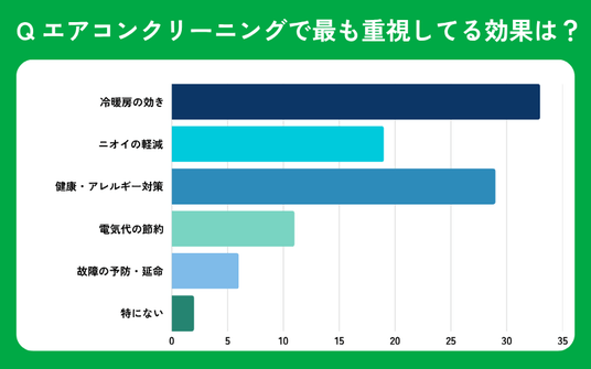 ・エアコンクリーニングの効果で最も期待が大きいのは「カビやホコリの除去」「冷暖房の効きの改善」。