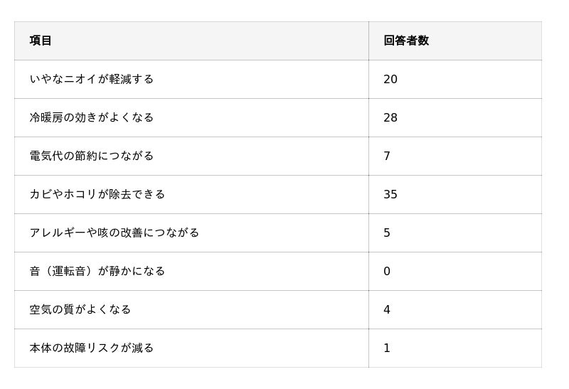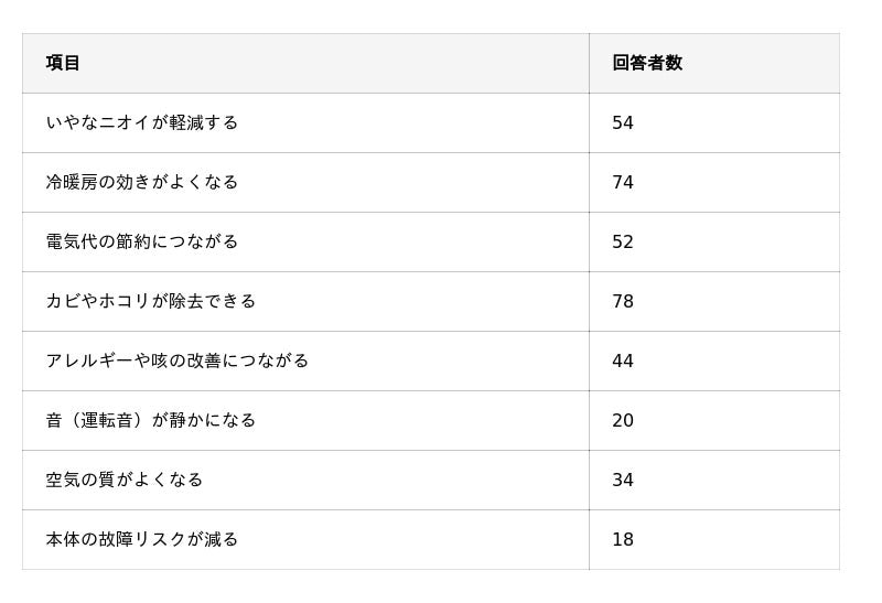 エアコンクリーニングで改善されそうな効果として思い浮かぶものをすべて選んでください。(複数回答可能)