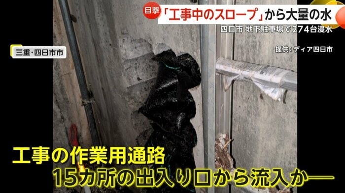 管理会社によると、作業用通路として穴を設けていて、スロープを含む15カ所の出入口全てから水が流れ込んだという。