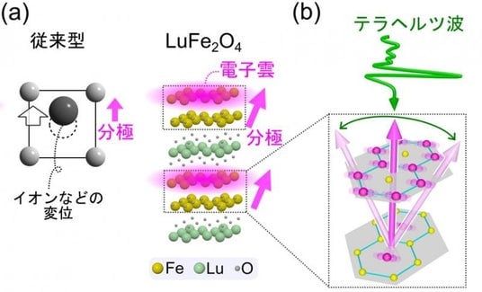 - 量子物質の一種である電子強誘電体のルテチウム鉄酸化物(LuFe2O4)に室温でテラヘルツ光を照射すると、これまで見つかったバルク強誘電体として過去最大の電気分極変化を示すことを発見しました。