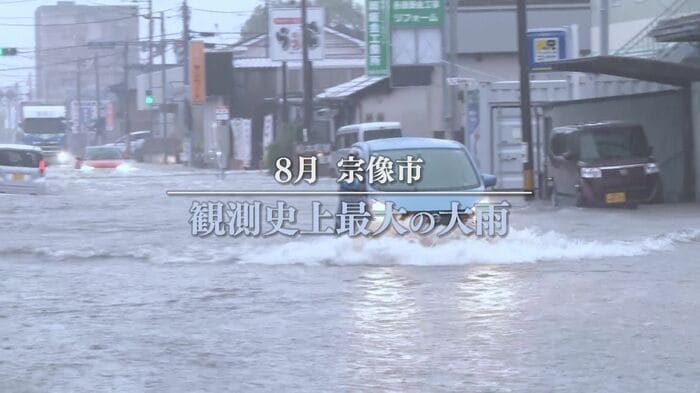 2025年8月、福岡・宗像市で発生した線状降水帯による大雨。観測史上最大の雨で、住宅の浸水や道路の冠水など大きな被害が出た。