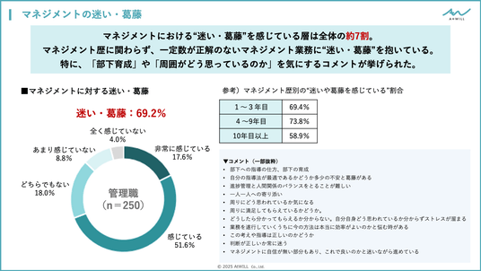 - 約7割がマネジメントにおける“迷い・葛藤”を実感。部下の育成や周囲がどう思うかを気にしていた