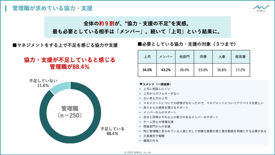 - 約9割が“協力や支援の不足”を感じており、「メンバー」「上司」のサポートを求める声が多かった