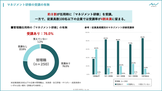 - 約8割が任用時に「マネジメント研修」を受講している一方、従業員100名以下の企業では受講率が4割未満にとどまり、企業規模による研修格差が浮き彫りとなった