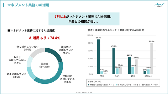 本結果は「管理職の実態調査2025」から一部を抜粋したものです。調査結果全体レポートに関しては当社へお問い合わせください。管理職の74.4%がAIを活用。年齢により活用度に顕著な違い。