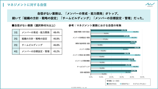 - 最も自信が持てない業務は「メンバーの育成・能力開発」