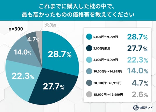 →これまでに購入した枕の最高価格帯は、約8割が1万円未満にとどまった。一方で、**1万円以上の高価格枕を購入した経験がある層は約20%**おり、一定数が「高級枕を試してみたい」「快眠に価値を感じている」層として存在している。