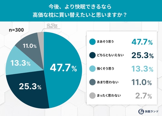 →「高い枕=快眠」と断言する人はわずか1割以下。多くの人は**価格よりも体感を重視**しており、自分に合った枕を探すプロセスを“快眠への投資”と考える人が多い傾向がうかがえる。