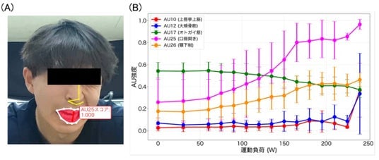 図1 (A) 表情解析の例, (B) 漸増負荷運動試験中の表情変化