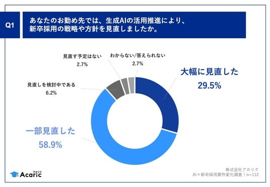 「Q1.あなたのお勤め先では、生成AIの活用推進により、新卒採用の戦略や方針を見直しましたか。」(n=112)と質問したところ、「大幅に見直した」が29.5%、「一部見直した」が58.9%という回答となりました。