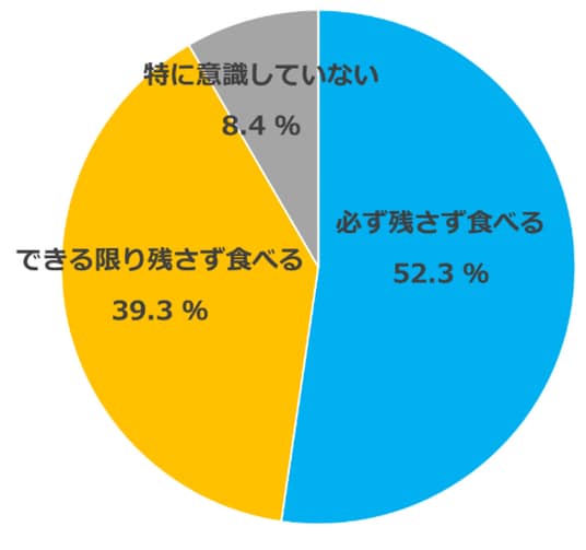 「あなたは外食をする際、できるだけ食べ残しをしないように意識していますか?」という質問では、「必ず残さず食べる」が最も多く52.3%、「できる限り残さず食べる」が39.3%で続き、「特に意識していない」は8.4%でした。