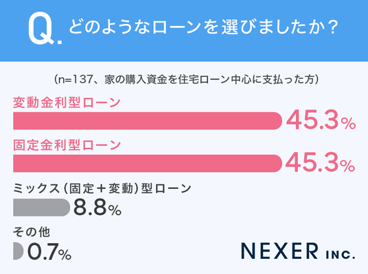 住宅ローンの種類は「変動金利型」と「固定金利型」がそれぞれ45.3%と同率首位となりました。