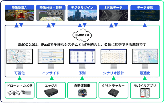 SMOC(Smart Mobility Operation Cloud)は、交通事業者・自治体・民間事業者向けに、交通量の可視化、運行計画の最適化、リアルタイムモニタリング、需要予測などの機能をクラウド上で統合的に提供するプラットフォームです。本プロジェクトでは、映像AI(エッジAI)も活用することで、移動の可視化の精度を高め、効率的な交通管理と安全・快適な都市交通運営を支援します。