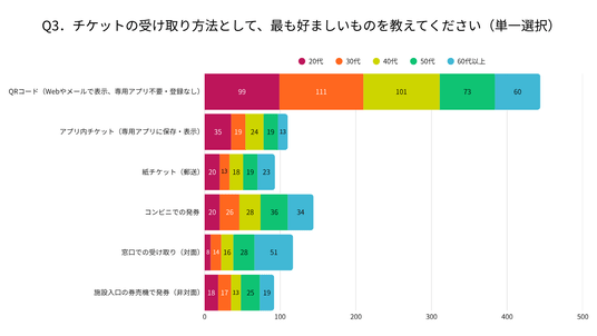 アンケート結果から、受け取り方法ではQRコードが最も支持されており、非接触・即時発行といったオンラインの利便性が評価されていることが分かります。一方で、紙チケットは「記念に残る」「高齢層でも扱いやすい」といった紙ならではの価値を持っていることが分かりました。