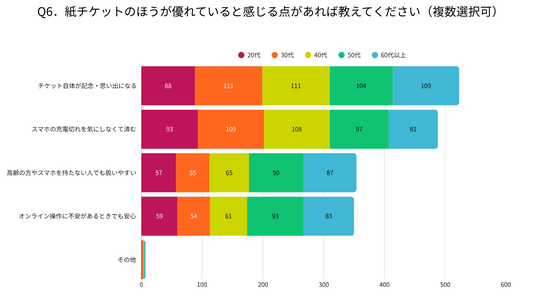 この結果から、紙チケットはイベントの記念品としての価値や、機器に依存しない安心感、幅広い世代に対応できる扱いやすさといった点で支持されており、利便性重視のデジタルチケットとは異なる優れた点があることが分かります。