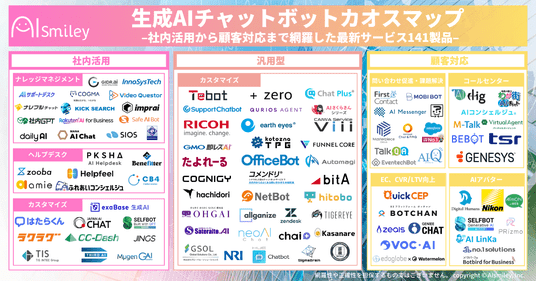 AIポータルメディア「AIsmiley」を運営する株式会社アイスマイリー(東京都渋谷区、代表取締役:板羽 晃司)は、社内活用から顧客対応まで網羅した最新の生成AIチャットボットをまとめた「生成AIチャットボットカオスマップ」を、2025年10月28日(火)に公開しました。掲載総数は141製品です。