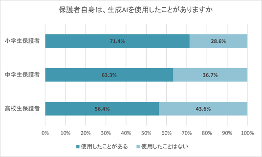 保護者自身が生成AIを使用したことがあるかについては、小学生保護者の71.4%、中学生保護者の63.3%、高校生保護者の56.4%が「使用したことがある」と回答した。2023年に実施した調査において、「使用したことがある」と回答した割合は、小学生保護者31.6%、中学生保護者22.5%、高校生保護者17.6%であり、使用経験がある保護者が顕著に増加していることが分かった。生成AIを使用した場面では、仕事での使用が全体の約60%、プライベートでの使用が全体の約75%だった。