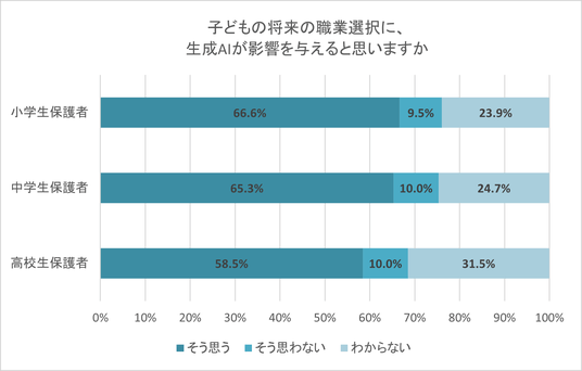 子どもの将来の職業選択に、生成AIが影響を与えていると思うかという質問に対しては、小学生保護者の66.6%、中学生保護者の65.3%、高校生保護者の58.5%が「そう思う」と回答した。