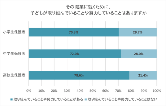 子どもには将来就きたい職業が「ある」と回答した保護者に、その職業に就くために、子どもが取り組んでいることや努力していることがあるかを聞いた。小学生保護者の70.3%、中学生保護者の72.0%、高校生 保護者の78.6%が「取り組んでいることや努力していることがある」と回答した。将来就きたい職業がある子どもは、その目標に向かって努力する傾向が大きいことが分かった。