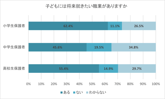 保護者に、子どもには将来就きたい職業があるか聞いたところ、小学生保護者の62.4%、中学生保護者の45.6%、高校生保護者の55.4%が「ある」と回答した。特に中学生保護者では、子どもに将来就きたい職業が「ない」、もしくは「わからない」と回答した割合が、小学生保護者・高校生保護者よりも高かった。