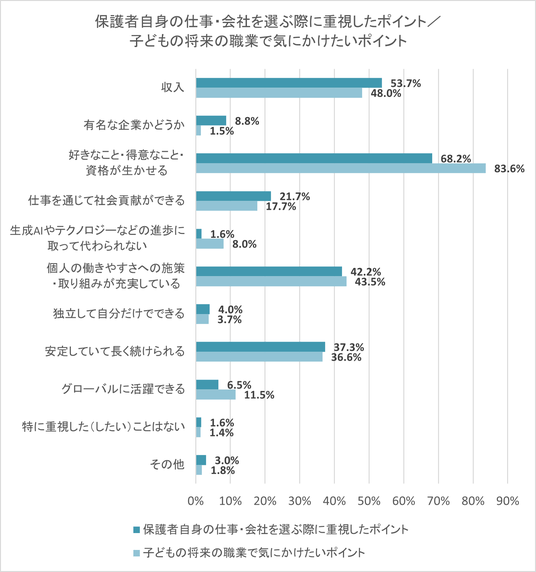 「保護者自身が今までに就いたことがある仕事・会社を選ぶ際に重視したポイント」および「将来子どもが就く職業について、保護者として気にかけたいポイント」を聞いた。