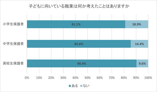 小学1年生~高校3年生の子どもをもつ保護者に、子どもに向いている職業は何か考えたことがあるかを聞いたところ、小学生保護者の81.1%、中学生保護者の85.6%、高校生保護者の90.4%が「ある」と回答した。