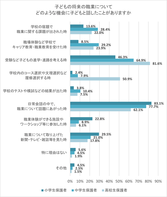 次に、「話したことがある」と回答した保護者に、どのような機会に子どもと話したことがあるかを聞いた。小学生保護者では「日常会話の中で、職業について話題にあがった時」が最も多く83.1%だった。中学生保護者では小学生保護者よりは割合は低いものの「日常会話の中で、職業について話題にあがった時」が最も多く77.7%、高校生保護者は「受験など子どもの進学・進路を考える時」が最も高く、81.6%だった。また、高校生では、「学校内のコース選択や文理選択など履修選択をする時」も約半数にのぼった。