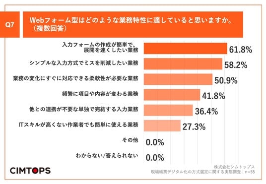 Q4で「十分理解していた」「ある程度理解していた」かつQ5で「Webフォーム型」「両方式を併用している」と回答した方に、「Q7.Webフォーム型はどのような業務特性に適していると思いますか。(複数回答)」(n=55)と質問したところ、「入力フォームの作成が簡単で、展開を速くしたい業務」が61.8%、「シンプルな入力方式でミスを削減したい業務」が58.2%、「業務の変化にすぐに対応できる柔軟性が必要な業務」が50.9%という回答となりました。