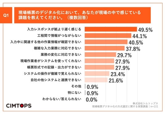 ■現場帳票のデジタル化における現場課題は、「入力レスポンスが紙より遅く感じる」が49.5%で最多