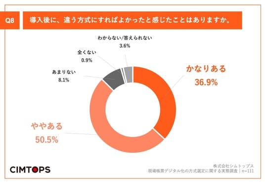 「Q8.導入後に、違う方式にすればよかったと感じたことはありますか。」(n=111)と質問したところ、「かなりある」が36.9%、「ややある」が50.5%という回答となりました。