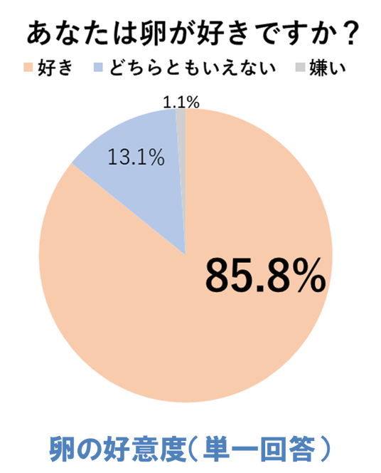 今年の調査では、卵に対する好意度が全体の85.8%(「とても好き」50.0%、「やや好き」35.8%の合計)に達し、前年と同様に高い水準を維持していることが分かりました。特に「とても好き」と回答した割合は前年から2.3ポイント増加しています。卵は依然として日本人に愛され続ける食材であることが分かりました。