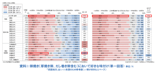 日本人の食文化を象徴する卵料理の一つである「卵焼き(厚焼き卵、だし巻き卵含む)」について、味付けの好みを初めて調査しました。