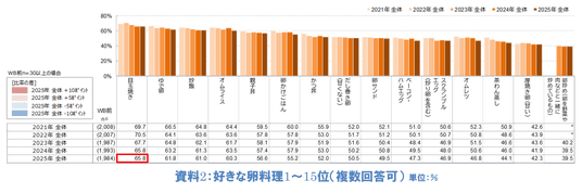 卵を使った料理に関する調査において、好きな卵料理の1位は「目玉焼き」で65.8%、次いで「ゆで卵」61.8%でした(資料2)。