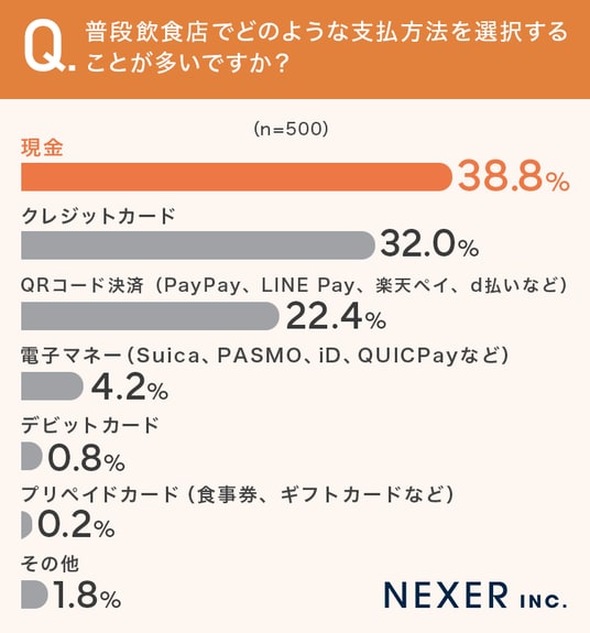 38.6%が「現金」、32%が「クレジットカード」、22.4%が「QRコード決済(PayPay、LINE Pay、楽天ペイ、d払いなど)」と回答しました。