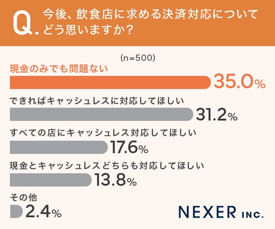 35%が「現金のみでも問題ない」、31.2%が「できればキャッシュレスに対応してほしい」と回答しました。