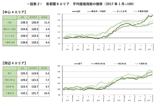 なお、東京都(23区/都下)、横浜市・川崎市、さいたま市、千葉県西部の5エリアは2017年1月以降最高額を更新した。さいたま市の最高額更新は2023年5月以来28カ月ぶり。