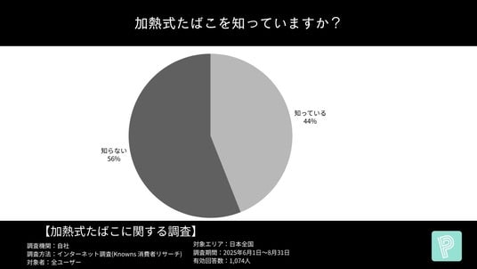 全国1,074名へ実施した調査では、加熱式たばこの認知率は全体で44%にとどまりました。