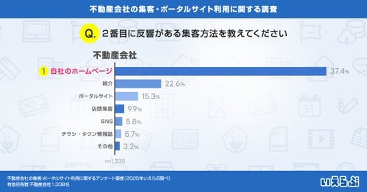 「2番目に反響がある集客方法を教えてください」という質問では、「自社のホームページ」が37.4%で最多となりました。続いて「紹介」(22.6%)、「ポータルサイト」(15.3%)となりました。