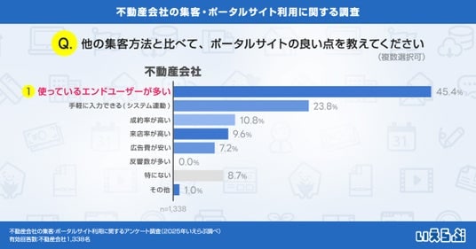 ポータルサイトの良い点としては、「利用しているエンドユーザーが多い」(45.4%)が最も多く、次いで「手軽に入力できる(システム連動)」(23.8%)が挙げられました。反響・集客の面だけでなく、業務効率化の側面でも評価されていることがうかがえます。