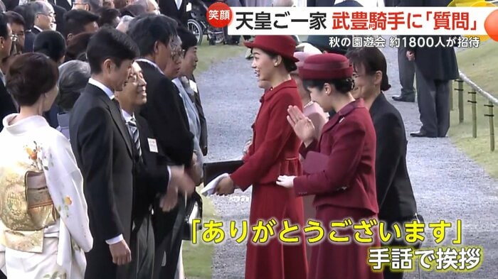 愛子さまは、佳子さまの勤務先の全日本ろうあ連盟元理事長の石野富志三郎さんに、手話で「ありがとうございます」とあいさつし、武豊さんには、レースについて熱心に質問された。