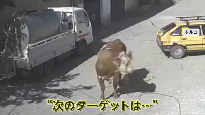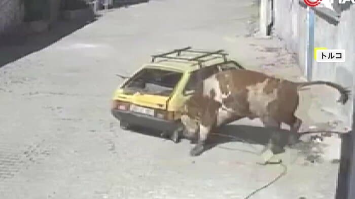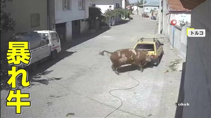 勢いよく車に突進したのは、牛舎から逃げ出したオスの暴れ牛だった。衝突の反動で後部のガラスが外れる様子もみられた。