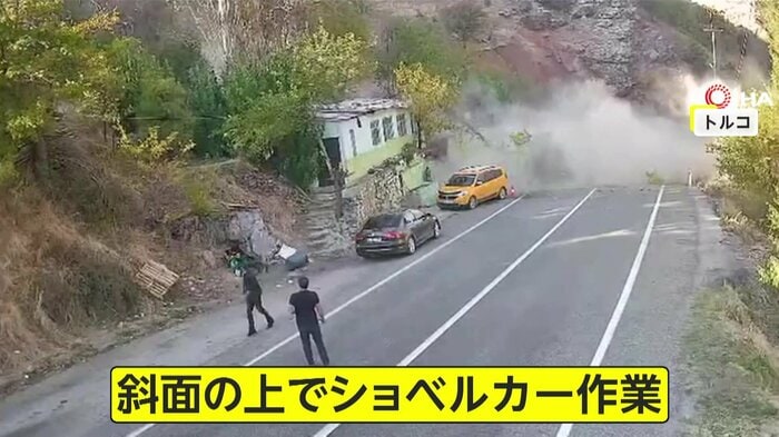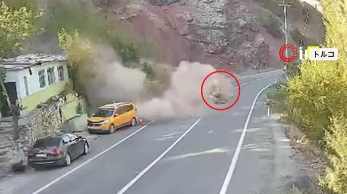 トルコの峠道で10月26日に撮影されたのは、大きな音を立てて転がってきた巨大な岩だった。建物をかすめて木などをなぎ倒し、谷底へと落ちていった。