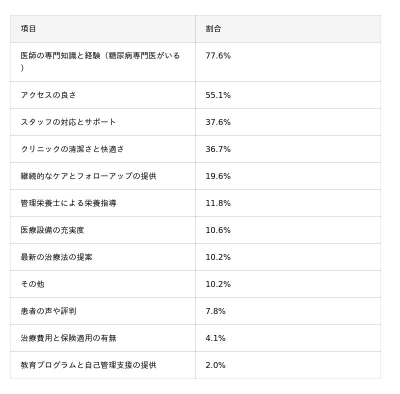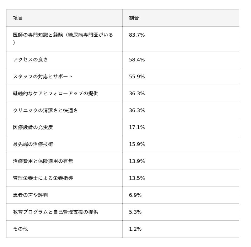 第5位には「医療設備の充実度」(17.1%)が挙がりました。糖尿病治療は血糖値測定や合併症チェックなど継続的な検査が欠かせず、設備の信頼性が患者に安心を与えることが推測されます。