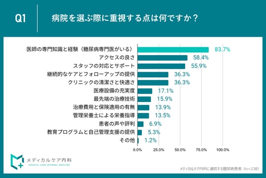メディカルケア内科(所在地:名古屋市名東区、院長:竹藤 聖子)は、当院に通院する糖尿病患者238名を対象に、「病院選びで重視するポイント」に関する意識調査を実施しました。