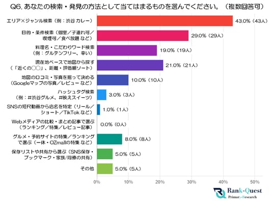 - 最も多かったのは「エリア×ジャンル検索(例:渋谷 カレー)」で、43.0%(43人)でした。エリアと料理ジャンルを組み合わせた具体的な検索方法が最も一般的であり、目的の場所や食べたい料理を明確にして探す実用的なスタイルが主流となっています。