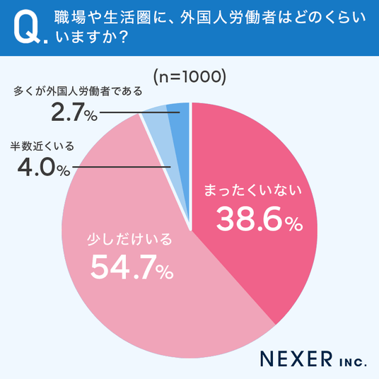 「少しだけいる」が54.7%ともっとも多く、「半数近くいる」が4%「多くが外国人労働者」が2.7%という結果になりました。