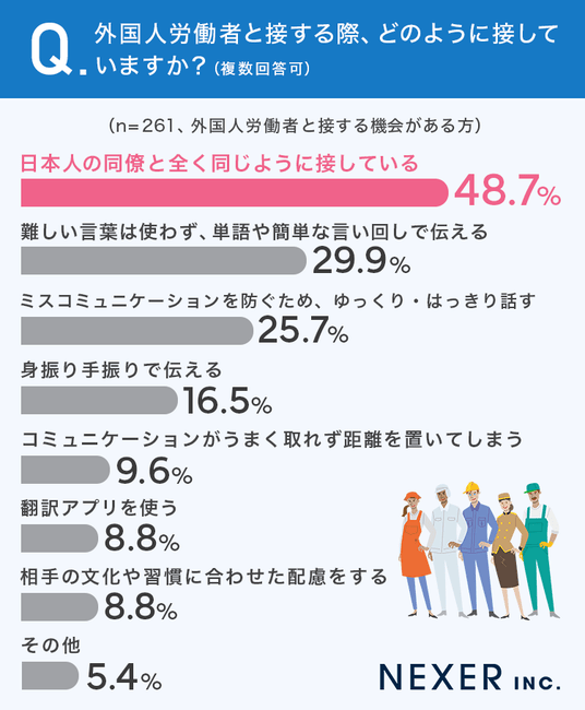 「日本人の同僚と全く同じように接している」と答えた方が48.7%でもっとも多い結果となりました。