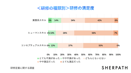 研修自体の満足度はヒューマンスキルが最も高く63%、コンセプチュアルスキルが50%と続く。