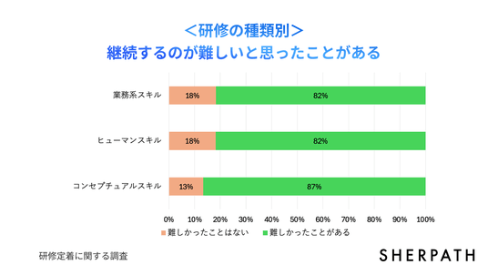 一方で、研修内容を実践するのが難しいと答えたのはすべての研修種別で80%を超え、研修の満足度と相関はないことがわかる。
