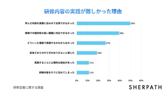 研修内容の実践が難しい理由として「学んだ内容を実務に合わせて応用できなかった」「現場での個別性の高い課題に対応できなかった」の回答が多く、実践することができた理由としては「実践する際にすぐに聞ける人がいた」「社内の同僚や上司が実践のサポートをしてくれた」などが上位となり、「研修の実践をサポートしてくれる存在」の重要性が伺える。